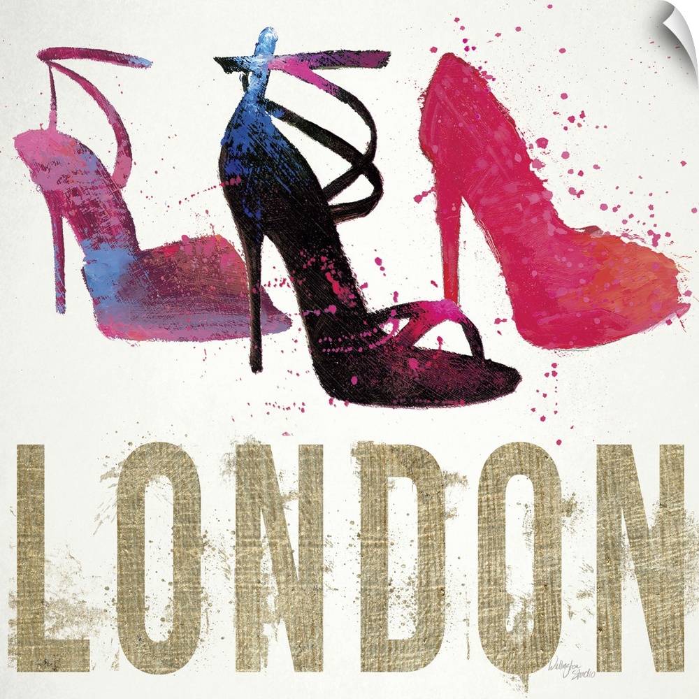 <p>Design featuring three high-heeled shoes and the word "London," done in a messy, spray-painted style.</p>