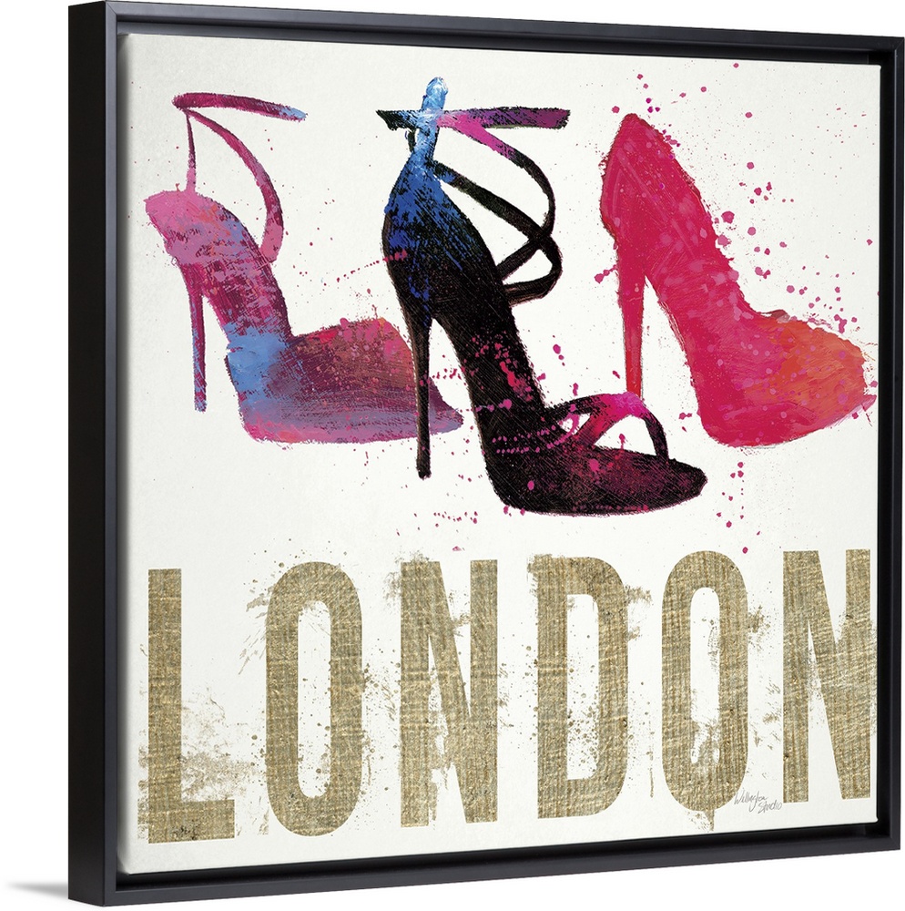 <p>Design featuring three high-heeled shoes and the word "London," done in a messy, spray-painted style.</p>