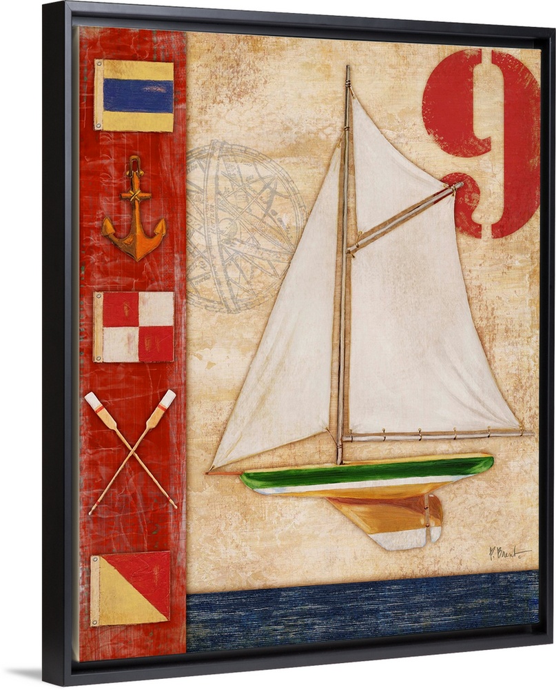 <p>Decorative artwork featuring a yacht and nautical elements, such as flags, an anchor, and oars.</p>