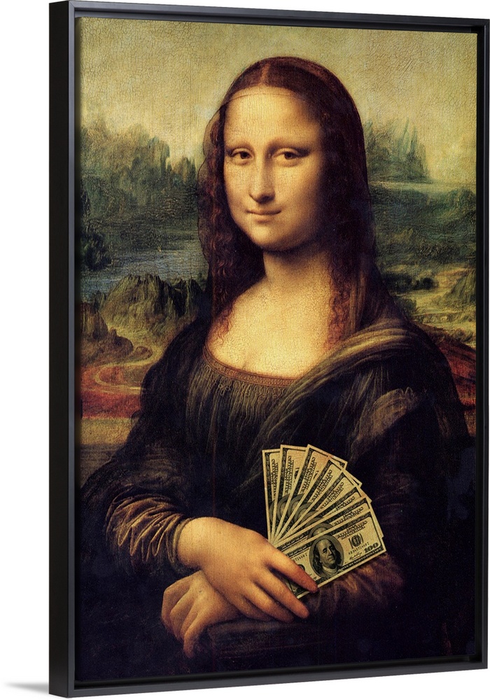 <p>Mona Lisa fanning a stack of one hundred dollar bills.</p>