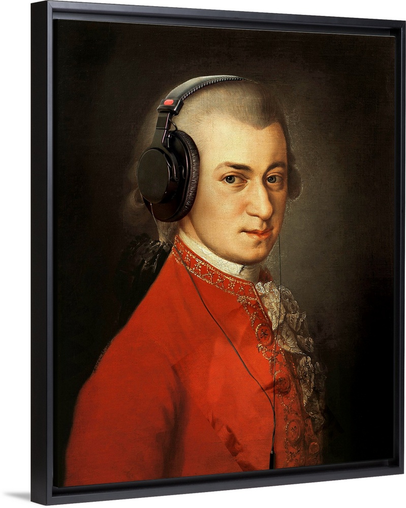 <p>A modern portrait of Wolfgang Amadeus Mozart with headphones.</p>