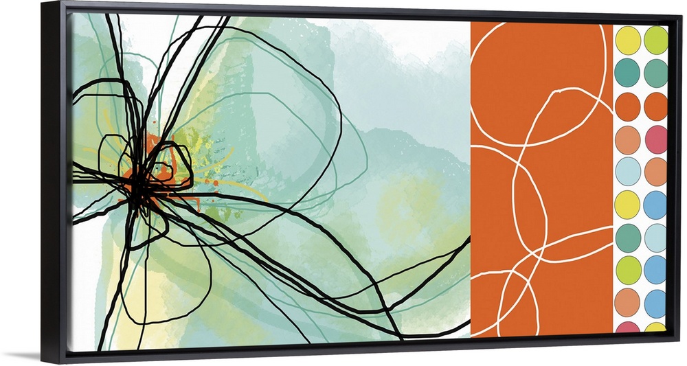 <p>Abstract canvas print of the outline of a flower on the left and multicolored polka dots on the right.</p>