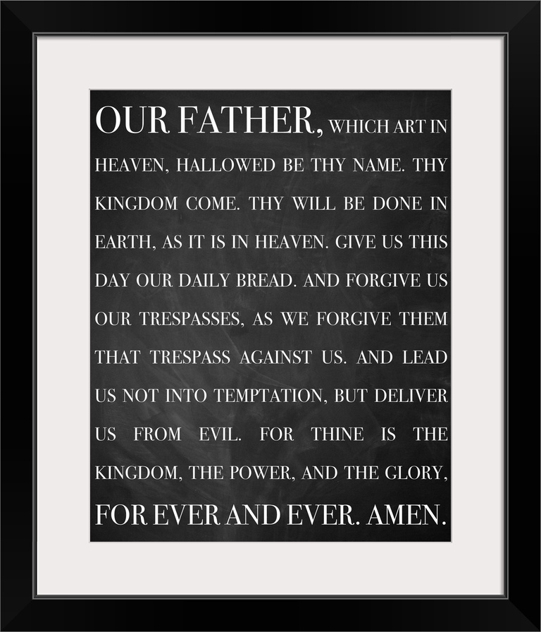 <p>A bold, monochromatic typographical image that displays the words of the Lord's Prayer in white letters across a black background.</p>