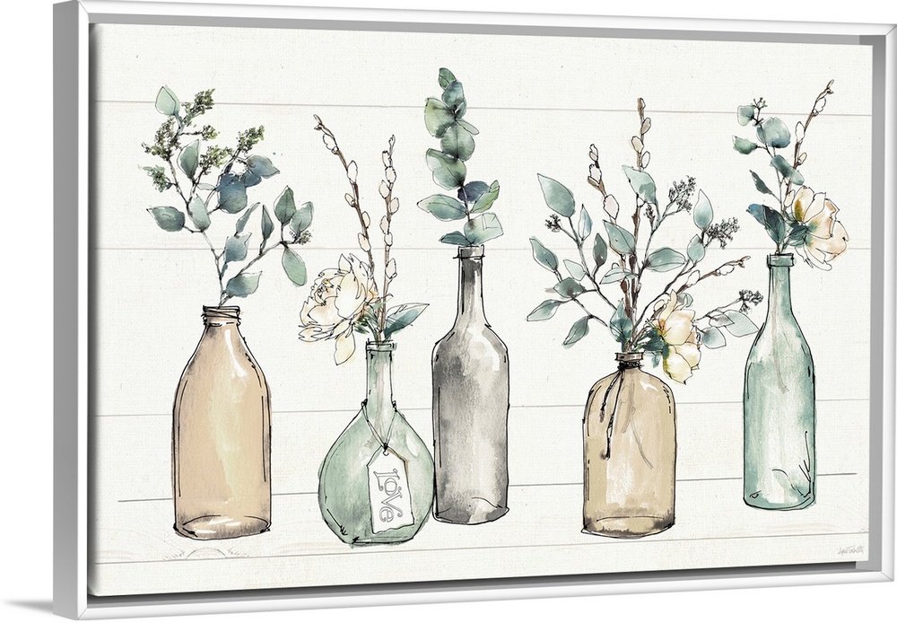 <p>A perfect accent piece to a shabby chic or farmhouse docor scheme, this lovely illustration of colored glass bottles holding sprigs of fresh greenery and flowers is set on a shiplap style background. The cohesive tones of green, cream and grey make for a serene composition, perfect for a kitchen, dining room or even bedroom.</p>