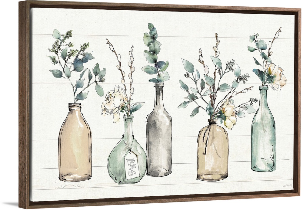<p>A perfect accent piece to a shabby chic or farmhouse docor scheme, this lovely illustration of colored glass bottles holding sprigs of fresh greenery and flowers is set on a shiplap style background. The cohesive tones of green, cream and grey make for a serene composition, perfect for a kitchen, dining room or even bedroom.</p>