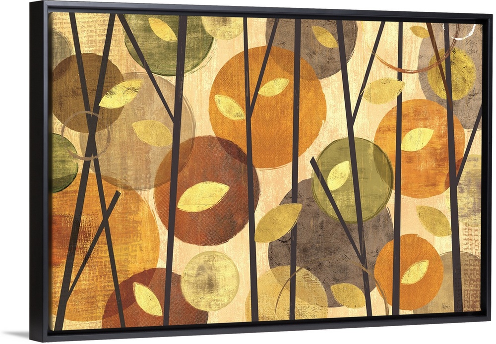 <p>Contemporary artwork of a forest of thin trees with broad leaves embellished with circular shapes.</p>
