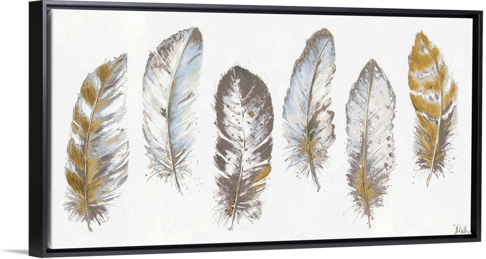 <p>Six feathers in shades of blue, gray, and gold.</p>