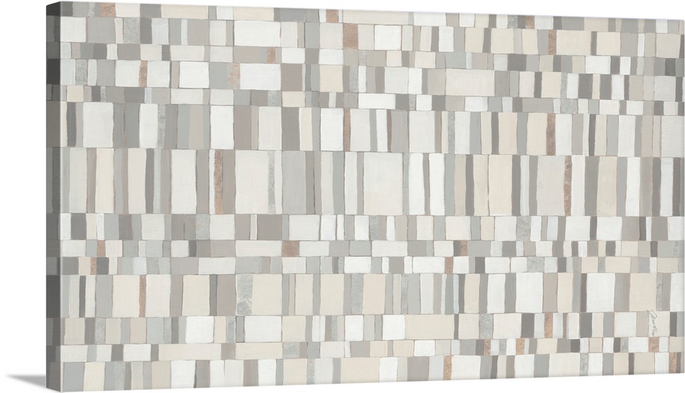 <p>Abstract artwork featuring a serene mosaic of irregular rectangular blocks in a neutral palette of grays, creams, and whites, with subtle bronze accents. Perfect for modern, minimalist decor.</p>