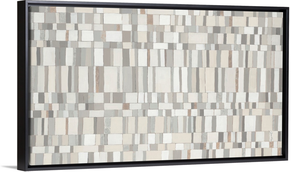 <p>Abstract artwork featuring a serene mosaic of irregular rectangular blocks in a neutral palette of grays, creams, and whites, with subtle bronze accents. Perfect for modern, minimalist decor.</p>