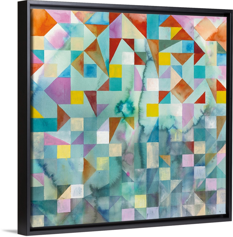 <p>Abstract artwork with colorful patchwork with geometric shapes on a square canvas.</p>