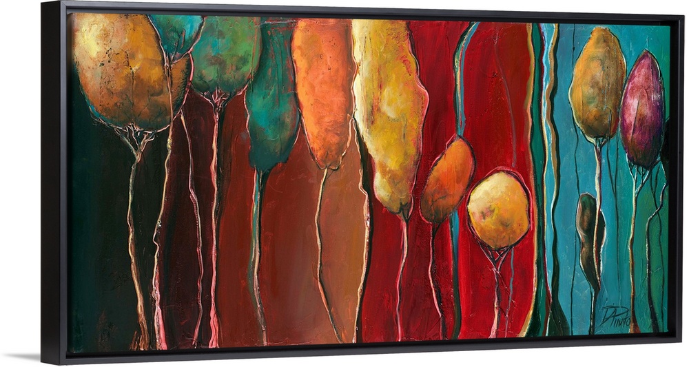 <p>A contemporary abstract painting of tall, skinny trees on a colorful background.</p>