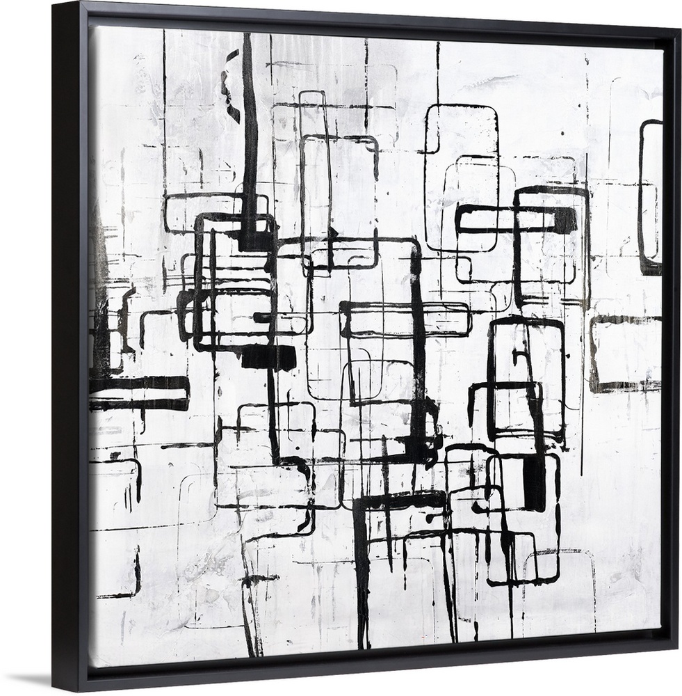 <p>Black and white painting of curved square shapes in varies sizes overlapping.</p>