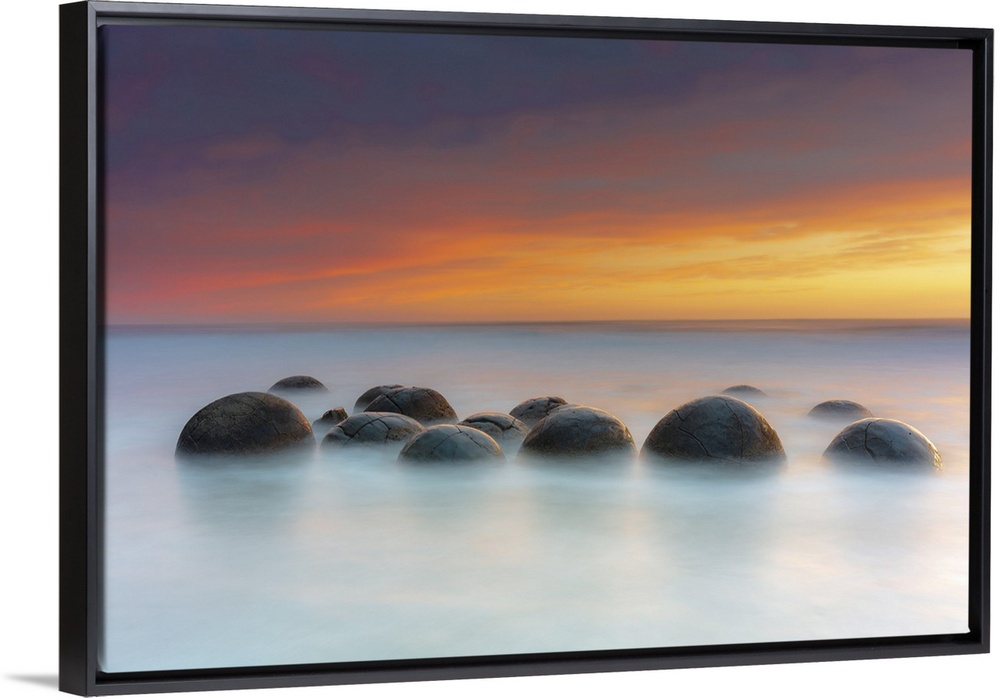 <p>Moeraki Boulders rock formations by the sea at sunrise, Otago, New Zealand</p>