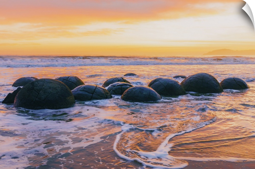 <p>Moeraki Boulders rock formations by the sea at sunrise, Otago, New Zealand</p>