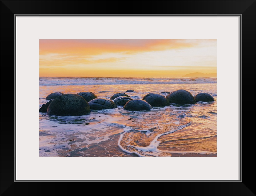 <p>Moeraki Boulders rock formations by the sea at sunrise, Otago, New Zealand</p>