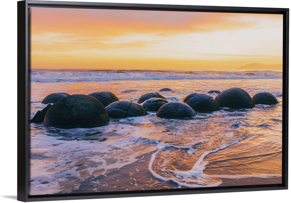 <p>Moeraki Boulders rock formations by the sea at sunrise, Otago, New Zealand</p>