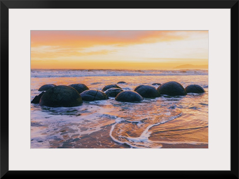 <p>Moeraki Boulders rock formations by the sea at sunrise, Otago, New Zealand</p>