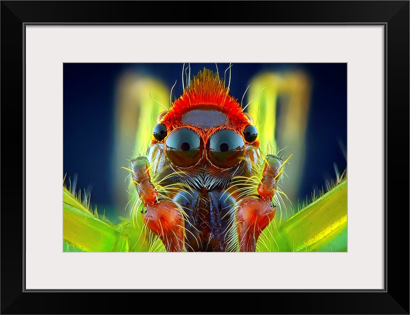 <p>Macro image of a colorful spider, with its large eyes visible.</p>