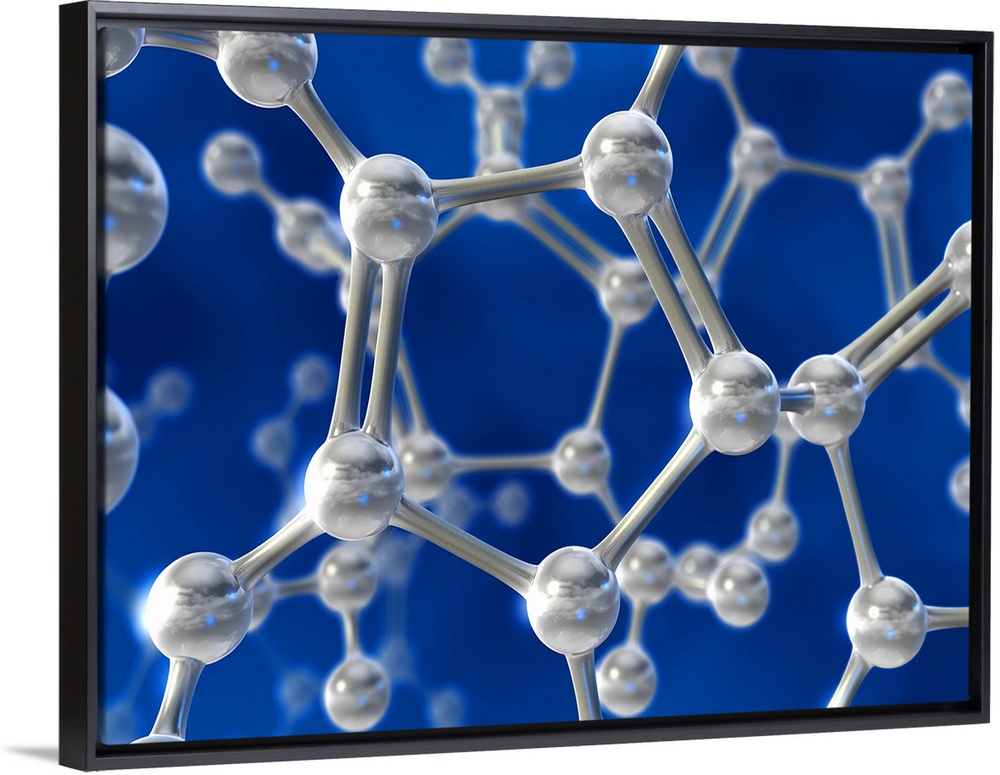 <p>Molecular model. Computer artwork of atoms (spheres) joined by bonds (rods) to make up a model of the structure of a molecule. Such models are used to help study and explain the properties of different materials. Here, the atoms at centre make up a ring of five atoms, with two sets of double bonds.</p>