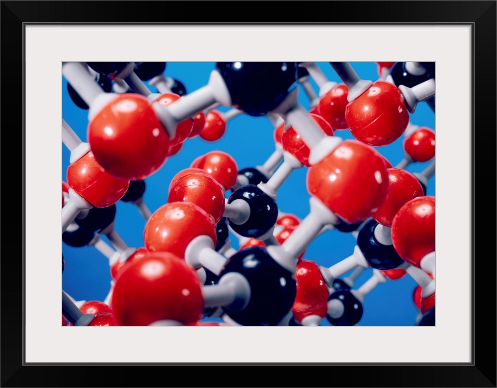<p>Quartz. Molecular model of quartz, one of the most abundant minerals in the Earth's crust. Quartz is a crystalline form of silica (silicon dioxide, SiO2). A crystalline structure consists of a repeating unit cell. Quartz has a unit cell of three silicon atoms (black balls) and six oxygen atoms (red balls). In the overall structure, each silicon atom forms bonds (sticks) with four oxygen atoms and each oxygen atom forms bonds with two silicon atoms. Crystals of quartz can now be produced synthetically and are mainly used in optical and scientific instruments and in electronics, such as quartz watches.</p>