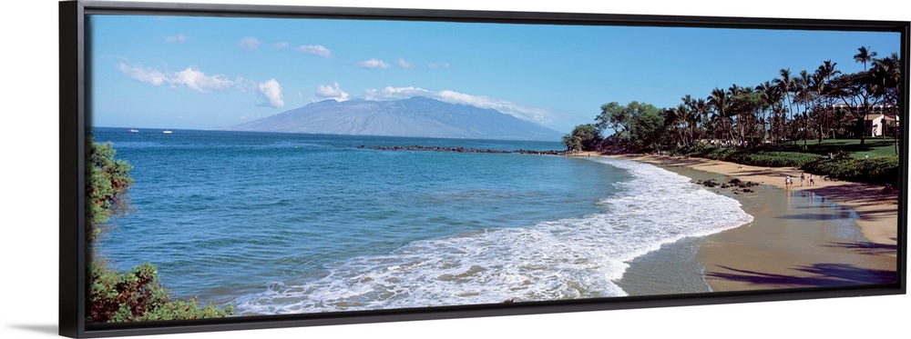 <p>This is a panoramic of a Hawaiian beach lined with palm trees and a mountain in the distance.</p>