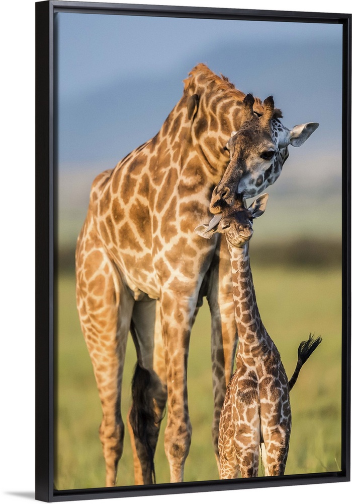 <p>A mother giraffe nuzzles its baby on the African plain.</p>