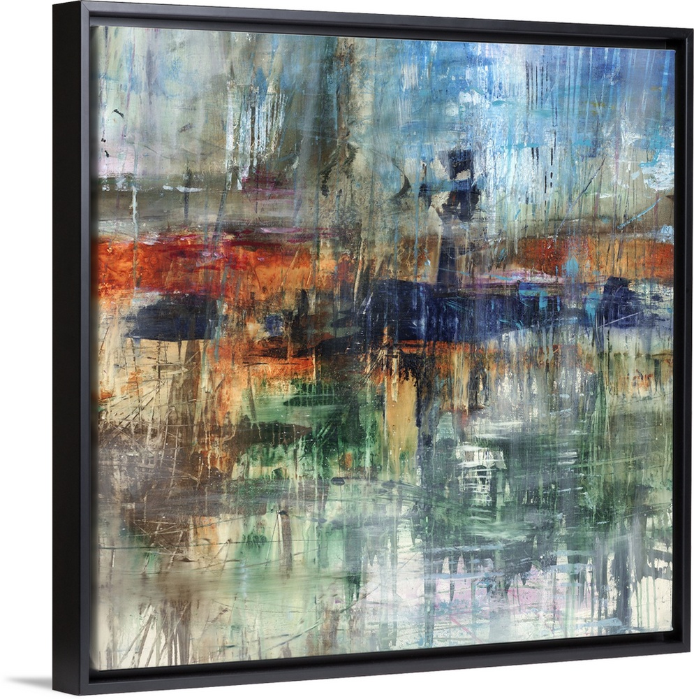 <p>Square abstract painting with various hues and streaks falling from top to bottom.</p>
