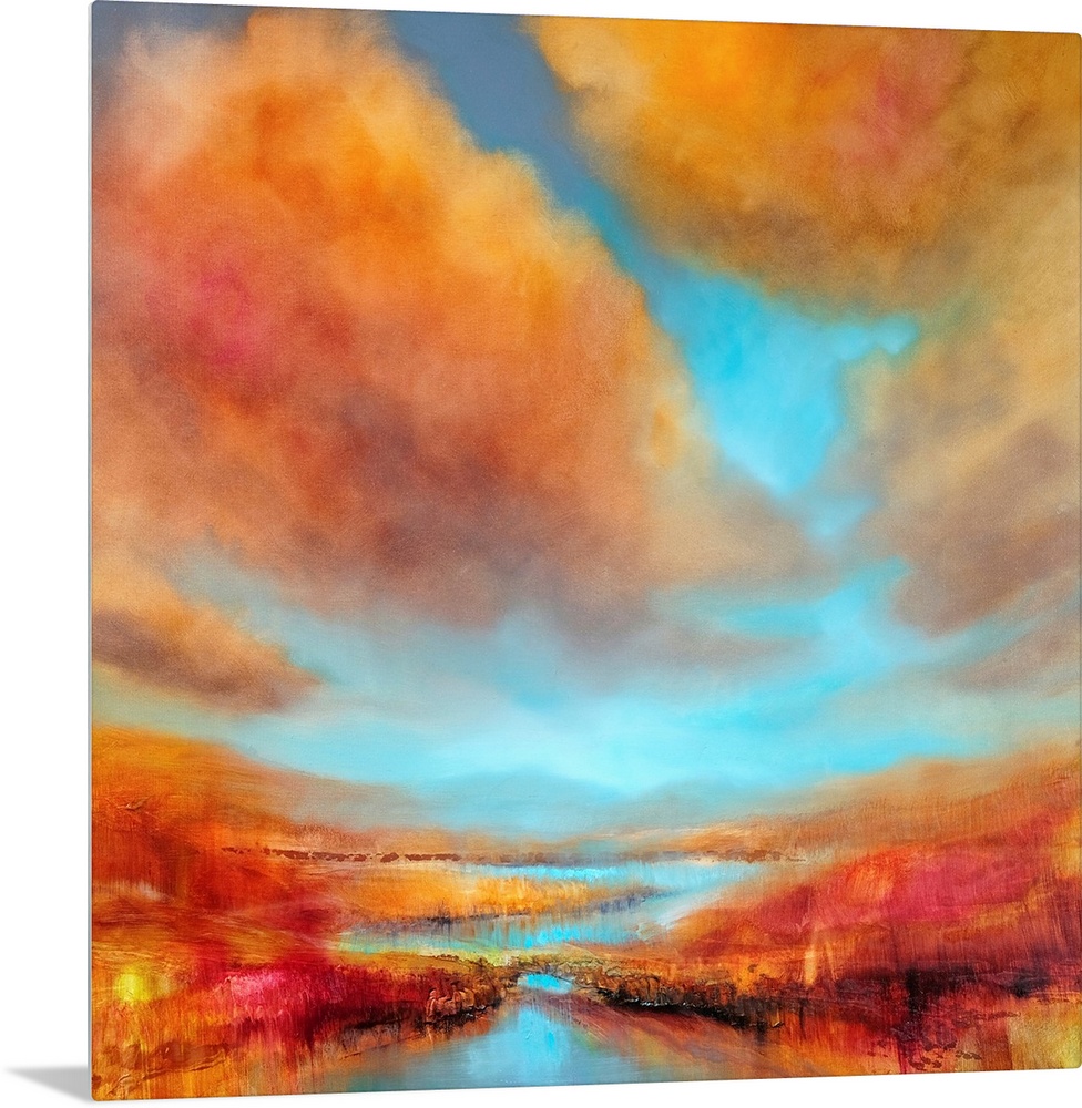 <p>Abstract painted landscape with vivid structures. Wide horizon, clouds, bright light, a river with coastlines that are reflected in the water. Intense blue, orange and red</p>