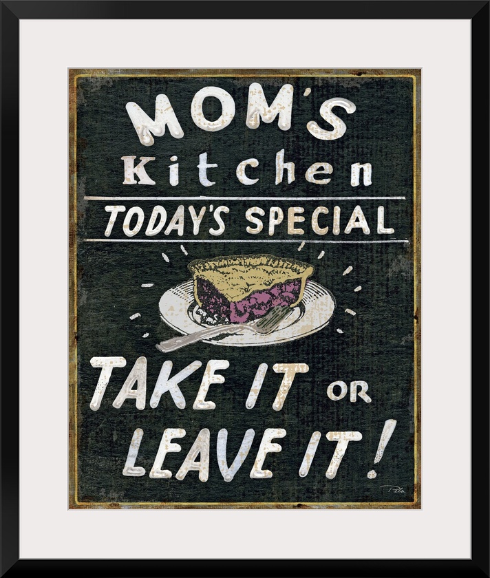 <p>Artwork perfect for the kitchen that has a piece of pie in the middle with large white text all around it.</p>