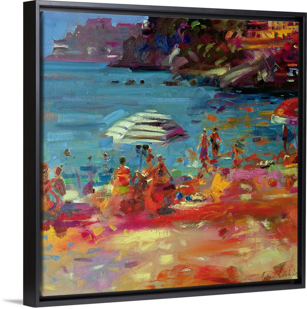 <p>Contemporary artwork of people painted sitting on a beach in front of the water and buildings on cliffs line the right side of the picture.</p>