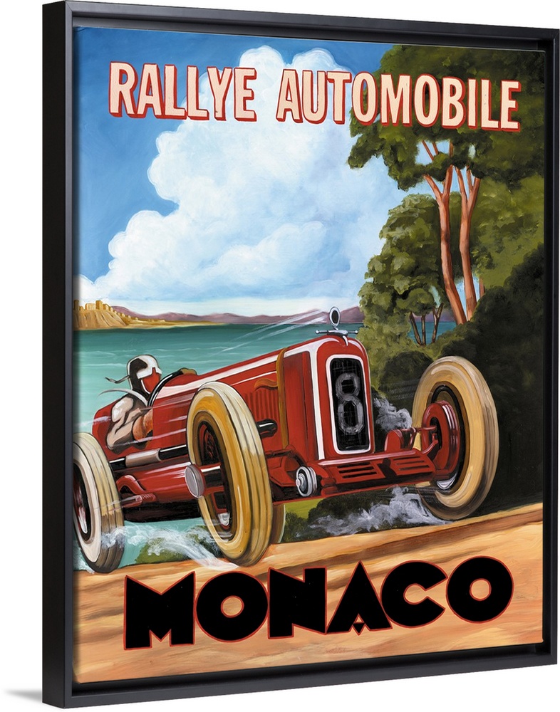 <p>Painted sign reading " Rallye Automobile Monaco" with a red vintage race car driving fast up a dirt path with the ocean in the background.</p>
