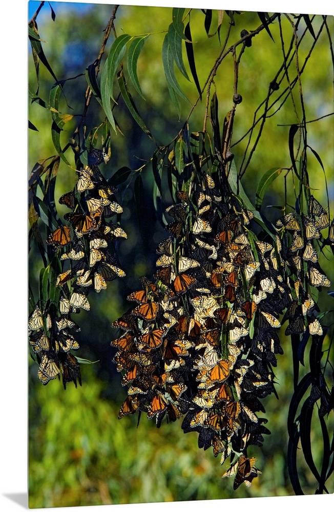 <p>Monarch butterflies (Danaus plexippus) overwintering in a tree. This butterfly is native to the Americas, Australia and New Zealand, and is found in other locations as well. Every year millions of monarch butterflies migrate to their hibernation sites, where they cluster together for protection and energy conservation. Photographed in California, USA.</p>