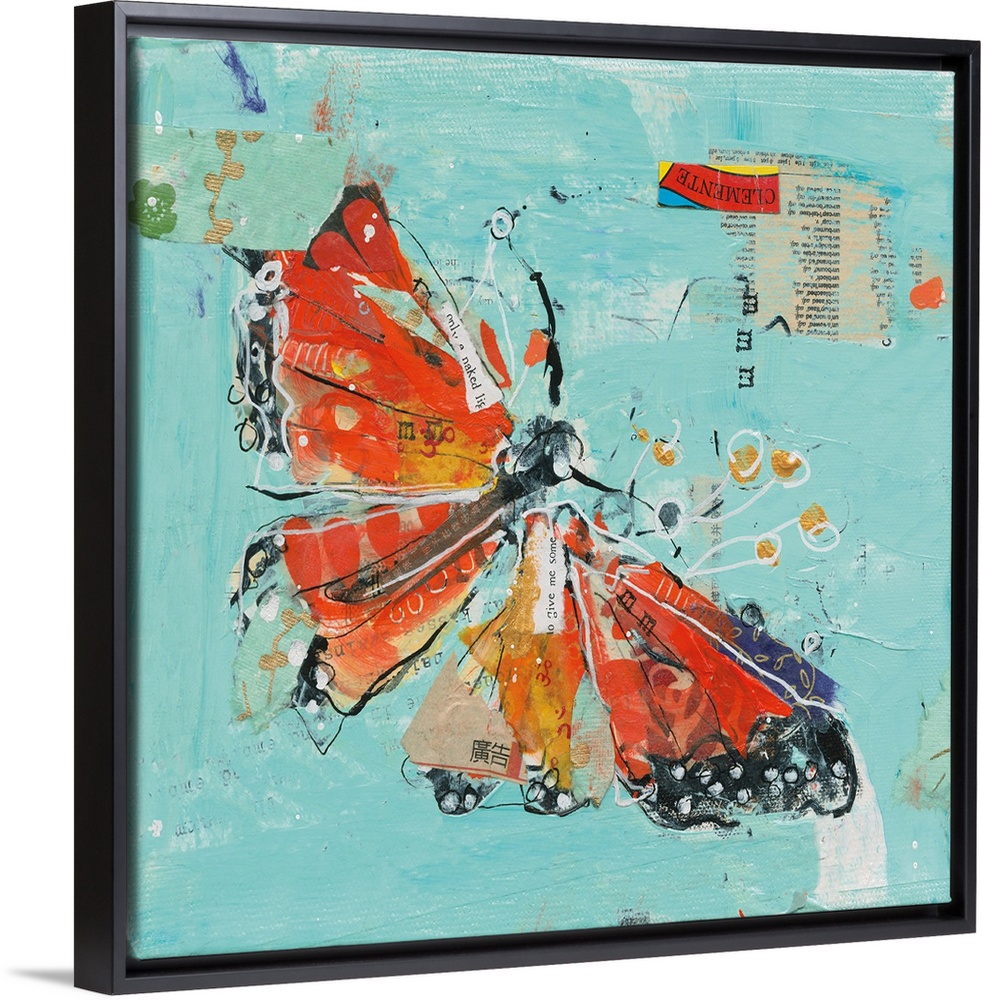 <p>Orange and red abstract monarch butterfly on a teal background made with mixed media.</p>