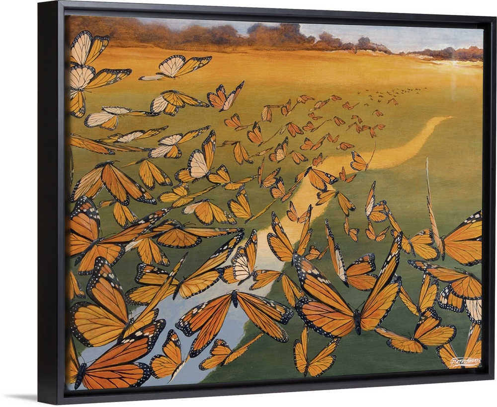 <p>Contemporary painting of a flock of migrating monarch butterflies flying over a river at sunset.</p>