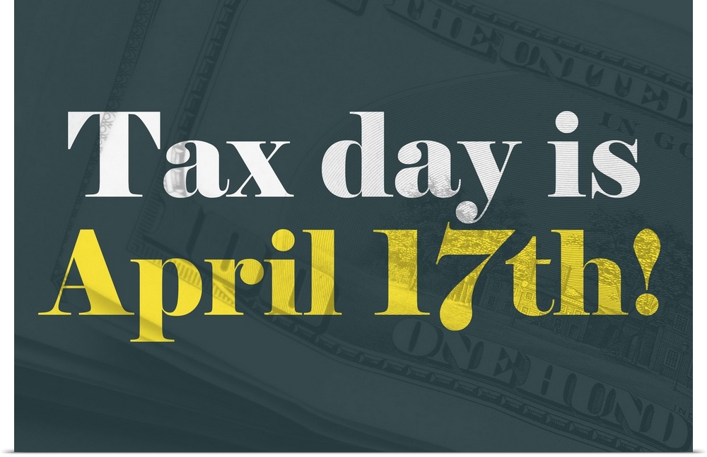 <p>"Tax Day Is April 17th!" written in white and yellow on top of a teal background with stacks of one hundred dollar bills.</p>