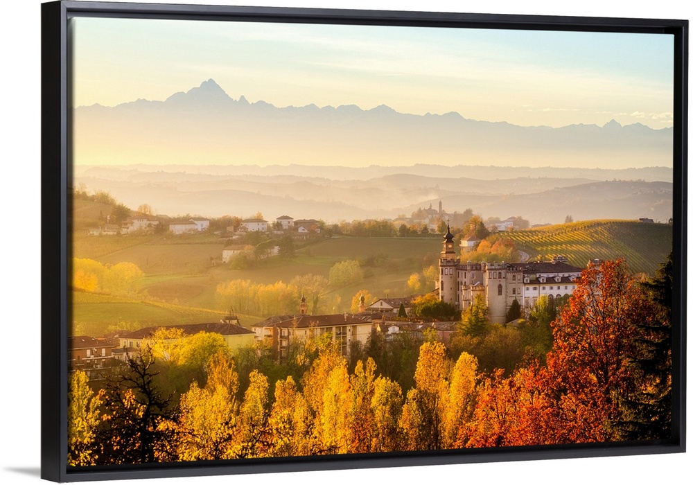 <p>Monferrato hills with foliage and view of Costigliole d'asti, Costigliole d'asti, Piedmont, Italy</p>