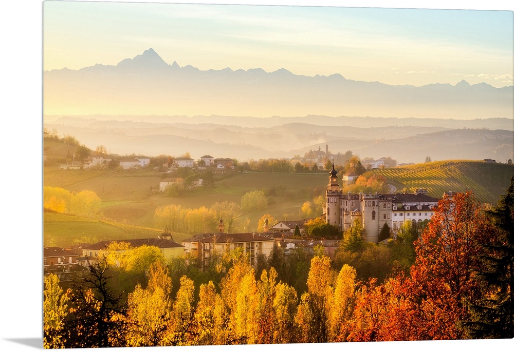 <p>Monferrato hills with foliage and view of Costigliole d'asti, Costigliole d'asti, Piedmont, Italy</p>