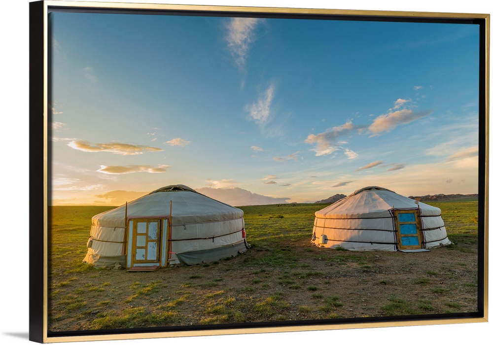 <p>Mongolian Nomadic Traditional Gers At Sunset. Middle Gobi Province, Mongolia.</p>