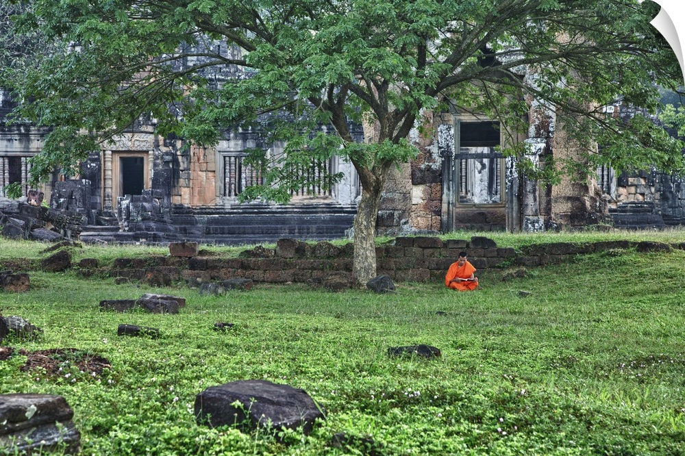 <p>Monk reading in grass in front of religious temples in Angkor Wat, Cambodia</p>