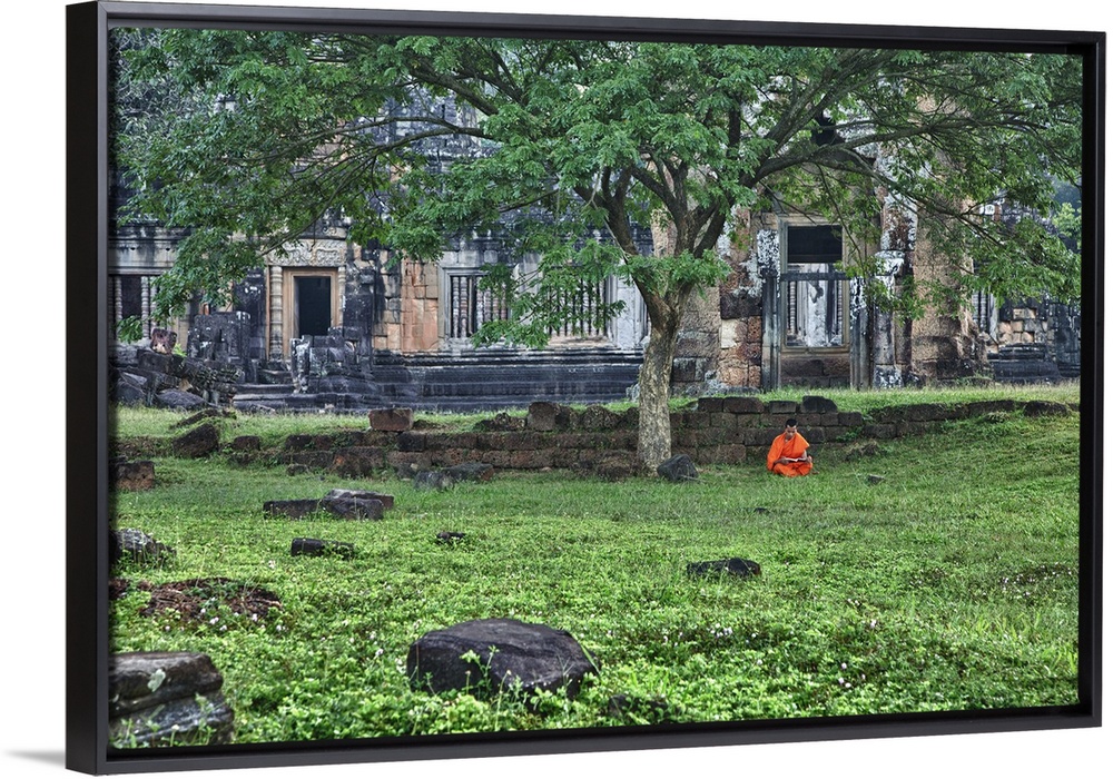 <p>Monk reading in grass in front of religious temples in Angkor Wat, Cambodia</p>