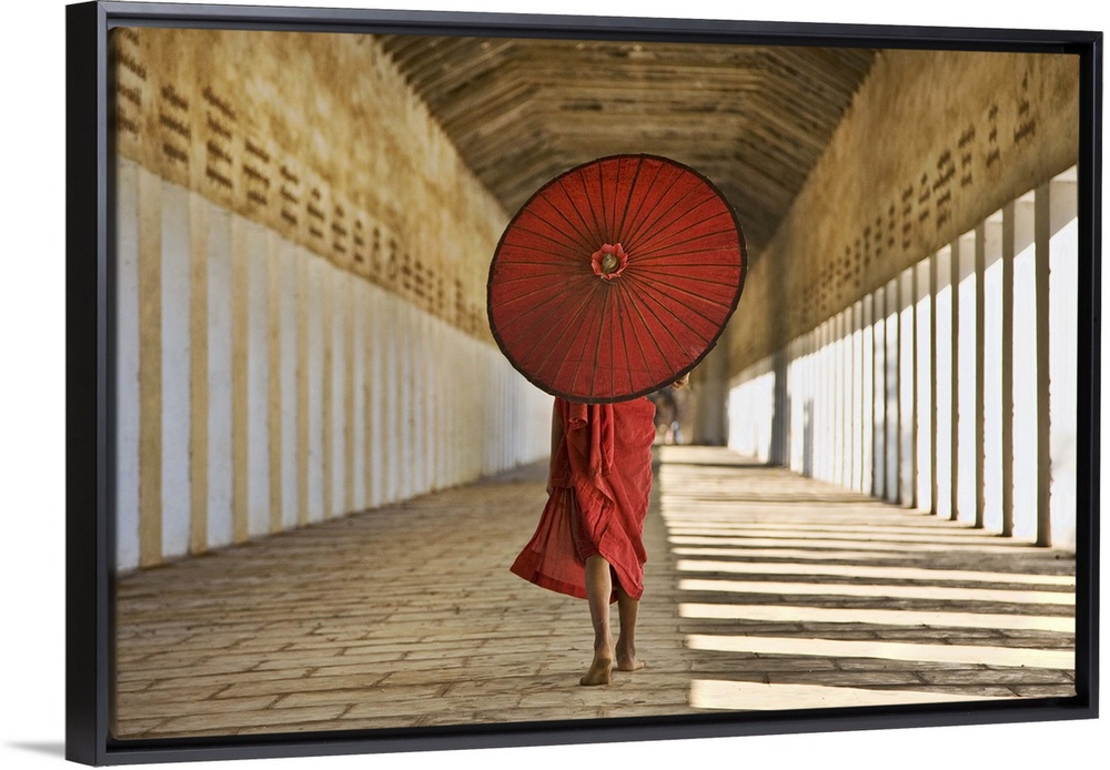 <p>Horizontal photograph of a Monk covered from the shoulders up by an umbrella, walking down the stone hallway of a monastery in Bagan, Burma.</p>