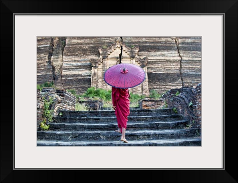 <p>monk with parasol walking up the steps to Mingun Monastery in Burma</p>