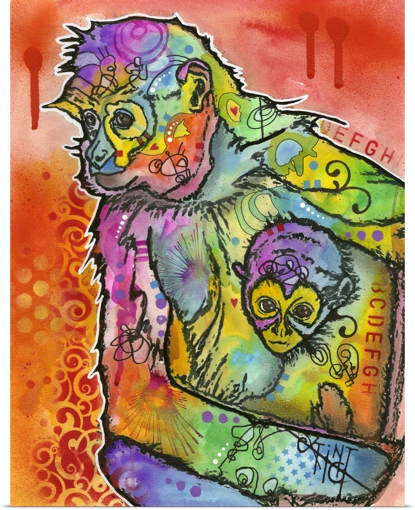 <p>Colorful painting of a mother monkey and her baby covered in abstract designs on an orange and red background.</p>