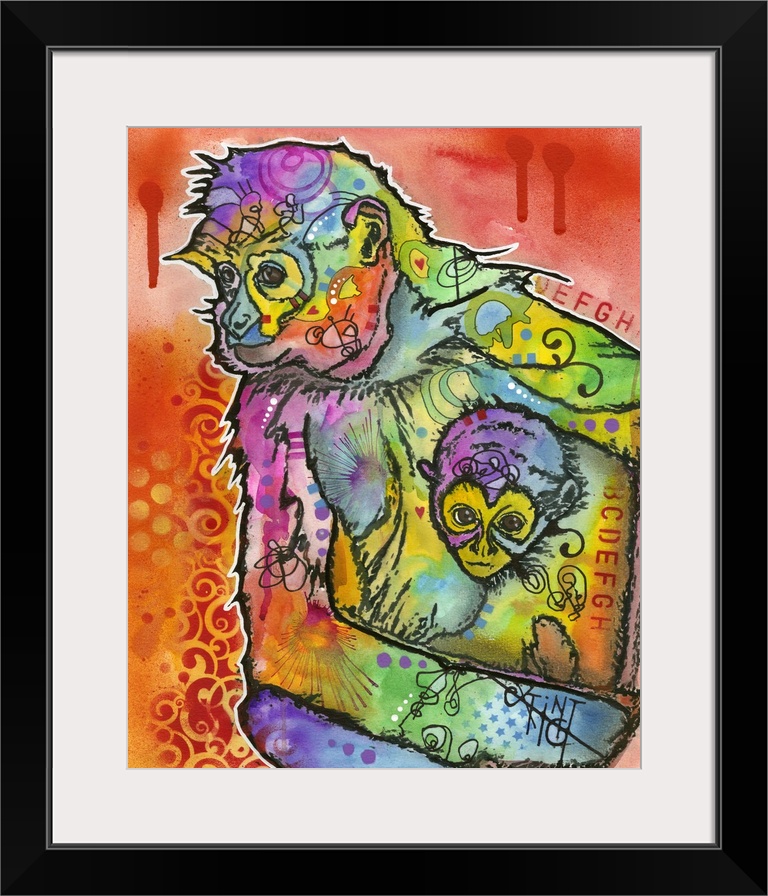 <p>Colorful painting of a mother monkey and her baby covered in abstract designs on an orange and red background.</p>