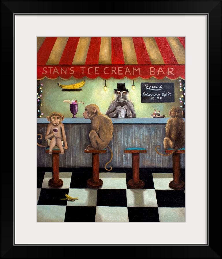 <p>Surrealist painting of an ice cream bar with monkeys sitting at it.</p>