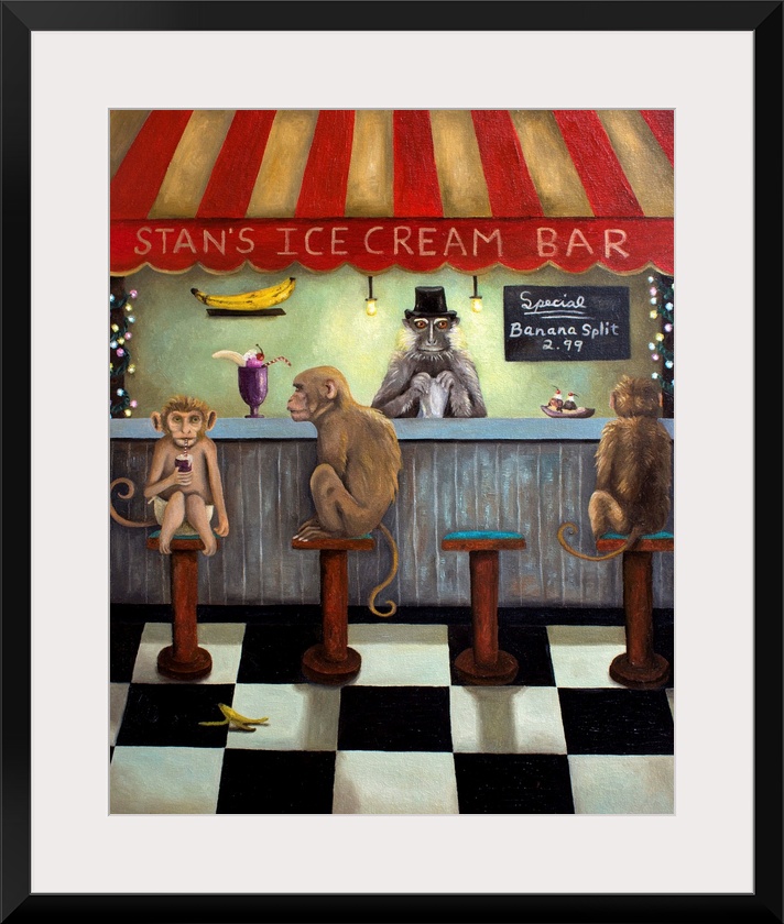 <p>Surrealist painting of an ice cream bar with monkeys sitting at it.</p>