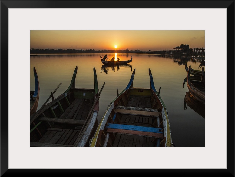 <p>Monks in longtail boat by the Ubein Bridge in Mandalay, Burma</p>