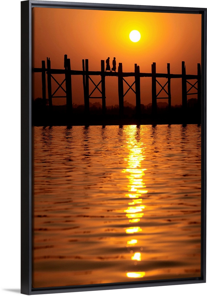 <p>Monks walking across the Ubein Bridge in Burma at sunset</p>