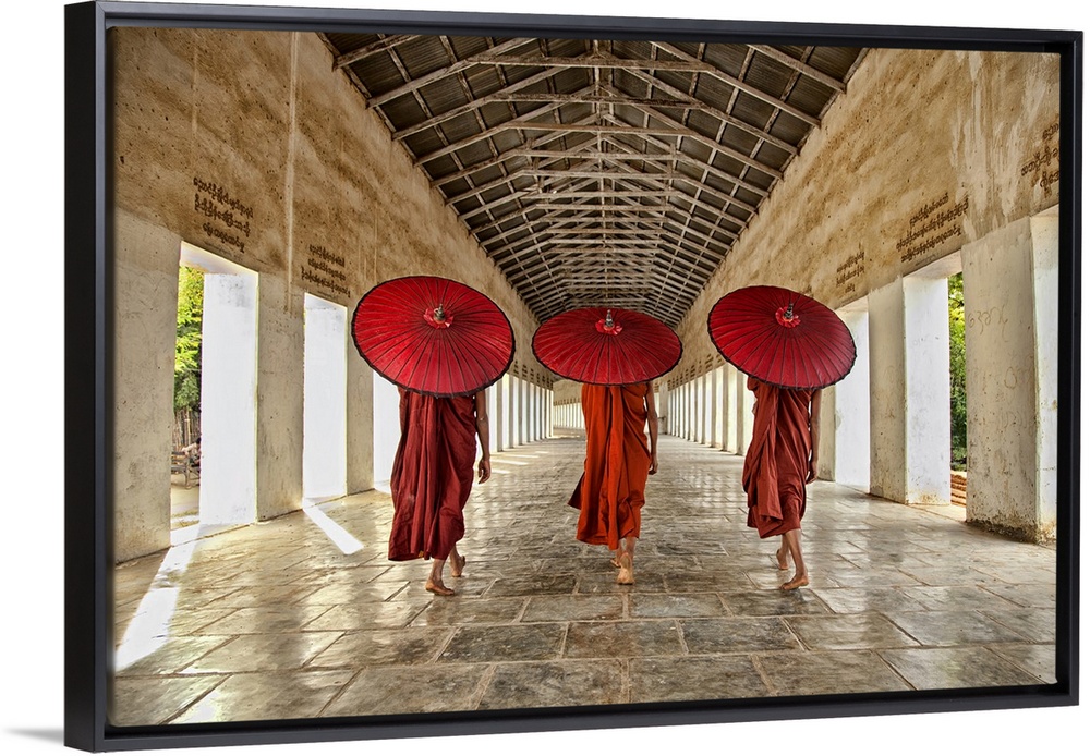 <p>Three monks in bright red walking in a row with umbrellas down a neutral open hallway.</p>