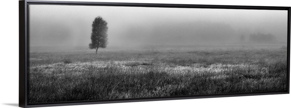 <p>A panoramic moonochrome black and white misty scottish landscape of a moorland with a lone tree in autumn.</p>